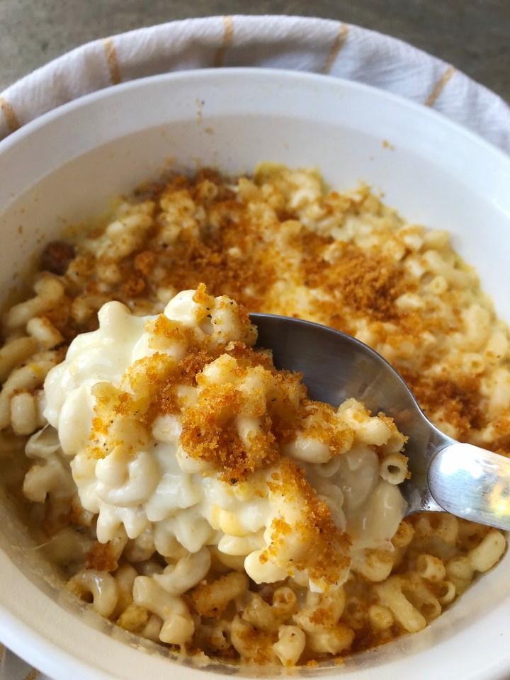 - Sprinkle pork rind “breadcrumbs” on top of mac and cheese.