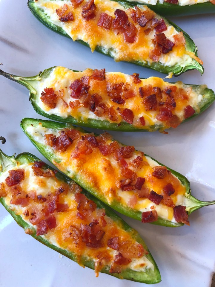 Often times jalapeño poppers are made by wrapping the stuffed jalapeño halves in a slice of bacon, but I found that method made the poppers a little messy and awkward to eat. These poppers are just as easy and simple to enjoy, as they are to assemble. The perfect snack for game day!